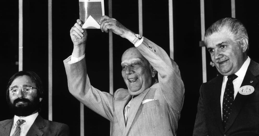 Ulysses Guimarães ergue a Constituição. Foto: Câmara dos Deputados